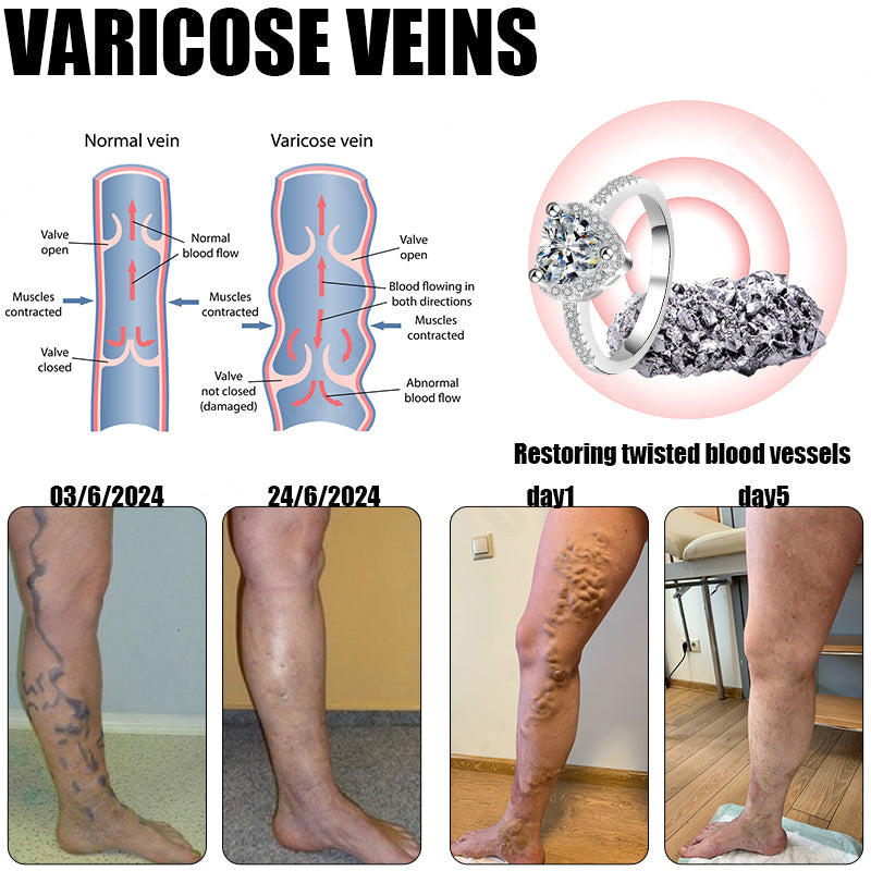 The tourmaline in the ring releases far-infrared rays, which penetrate the skin and bind with negative ions in the body. This helps reduce venous pressure, relieve leg swelling, heaviness, and cramps, and is particularly effective in treating varicose veins. Results are typically seen within one week.