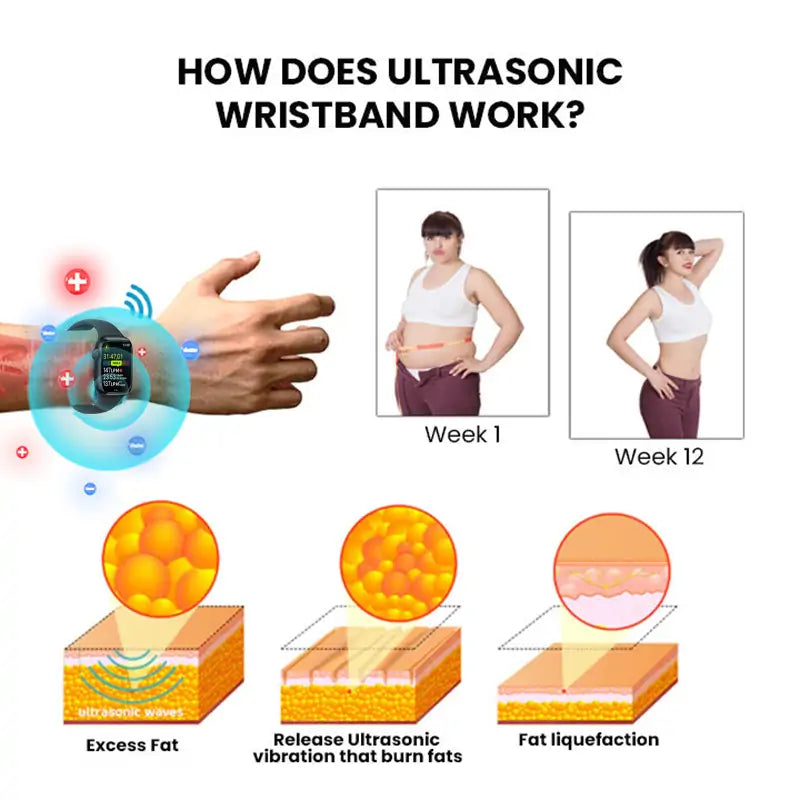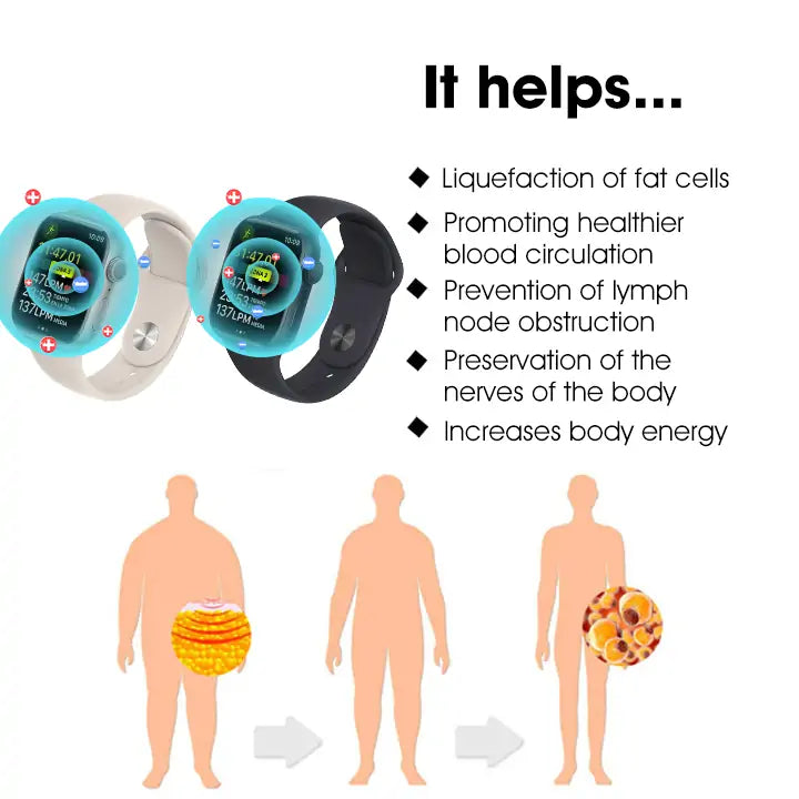 The bracelet uses both far-infrared and ultrasonic technologies. These two technologies work together to dissolve stubborn fat. help regulate blood sugar levels. promote overall blood circulation. enhance lymphatic circulation. reduce swelling. and detoxify the entire body.