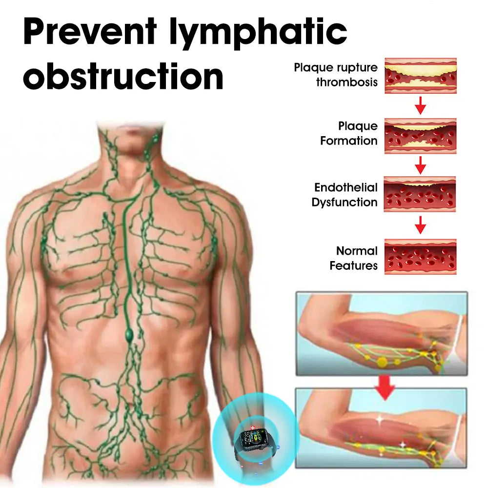 The bracelet uses 850mm rays to penetrate blood vessels directly. This stimulates the production of nitric oxide. which improves blood sugar sensitivity and insulin resistance. As a result. the absorption of glucose in the blood is enhanced. reducing the accumulation of excess glucose and promoting balanced blood sugar levels.